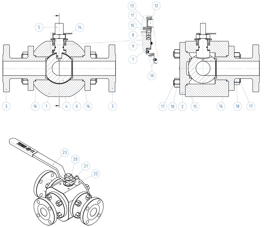 H2 INVICTUS (เอชทู อินวิคตัส) MAGNUM (แม็กนัม) THOR THOR Split Body THOR Split Body 3 ways 4 seals (ธอร์ สปลิตบอดี้ 3 เวย์ 4 ซีล) PROCHEMIE 60 (โปรเคมมี 60) HERCULES (เฮอร์คิวลีส) KRATOS (เครโทส) SUPREME TRUNNION (ซูพรีม ทรันเนียน) OTHER BRASS BALL VALVES (วาล์วลูกบอลทองเหลืองอื่น ๆ) OTHER CAST IRON BALL VALVES (วาล์วลูกบอลเหล็กหล่ออื่น ๆ) OTHER STAINLESS STEEL BALL VALVES (วาล์วลูกบอลสแตนเลสอื่น ๆ) OTHER CARBON STEEL BALL VALVES (วาล์วลูกบอลเหล็กกล้าคาร์บอนอื่น ๆ) OTHER PVC BALL VALVES (วาล์วลูกบอลพีวีซีอื่น ๆ) Download General catalogue ดาวน์โหลด Actuator Accessories Catalogue การถอดรหัส MAGNUM & THOR กำหนดค่าผลิตภัณฑ์ของคุณ ดาวน์โหลดไฟล์ 2D และ 3D ในหลายรูปแบบ ดาวน์โหลด Sales conditions มาโคร วาล์วบอล หมวดหมู่ THOR หมวดย่อย THOR Split Body 3 ways 4 seals (ธอร์ สปลิตบอดี้ 3 เวย์ 4 ซีล) ครอบครัว THOR Split Body 3 ways 4 seals PN 16-40 ANSI 150 (วาล์วบอลสามทาง แบบแยกตัว ซีล 4 ชั้น PN 16-40 ANSI 150) กำหนดค่า ระบบขับเคลื่อน ขอข้อมูล พิมพ์หน้าเว็บ ดาวน์โหลดแค็ตตาล็อก THOR SPLIT BODY 3 WAYS 4 SEALS (ธอร์ สปลิตบอดี้ 3 เวย์ 4 ซีล) ถอดรหัส ประโยชน์ คุณลักษณะ มิติ วัสดุ แผนภาพและแรงบิดเริ่มต้น ข้อกำหนดทางเทคนิค อุปกรณ์เสริม เอกสาร 1. อุปกรณ์ป้องกันไฟฟ้าสถิต (ความต่อเนื่องทางไฟฟ้าระหว่างลูกบอล, ก้าน และตัววาล์ว)ป้องกันไฟฟ้าสถิตซึ่งอาจก่อให้เกิดประกายไฟและไฟไหม้ในสภาพแวดล้อมที่ติดไฟ/ระเบิดได้รับประกันความปลอดภัยในการสัมผัสตลอดอายุการใช้งานของวาล์ว2. แหวนรองกันเสียดสีคู่รับประกันแรงบิดเริ่มต้น (Breakaway Torque) ที่ต่ำกว่าการสึกหรอน้อยกว่าการใช้แหวนรองเพียงชิ้นเดียว3. ชุดซีลแบบ “V”; ซีล 3 ชั้น + โอริงรับประกันการซีลที่สมบูรณ์แม้หลังจากผ่านการใช้งานจำนวนรอบสูง4. แหวนสปริงสำหรับซีลก้านวาล์วรับประกันการชดเชยช่องว่างที่เกิดจากการสึกหรอของการหมุนก้านวาล์ว ป้องกันการรั่วซึมออกสู่ภายนอกรักษาการกดซีลแบบ “Chevron” (V) ให้แน่นอยู่เสมอ ป้องกันการรั่วซึมต่อภายนอก แม้ภายใต้อุณหภูมิที่เปลี่ยนแปลงอย่างรุนแรง5. ซีลกราไฟต์แบบยืด (Stretch Graphite Seal)รับประกันการซีลสู่ภายนอกโดยไม่ขึ้นอยู่กับการเปลี่ยนแปลงอุณหภูมิที่วาล์วเผชิญความแม่นยำสูงขึ้น ในการจัดแนวแกนเนื่องจากการกำหนดตำแหน่งเฉพาะตั้งแต่กระบวนการผลิตจากวัตถุดิบจนถึงวาล์วสำเร็จรูปแรงบิดเริ่มต้นต่ำกว่าอายุการใช้งานวาล์วนานขึ้นการบำรุงรักษาง่าย โดยตรงที่หน้างานลดค่าใช้จ่ายในการบำรุงรักษาตัววาล์วผลิตจากเหล็กคาร์บอน พร้อมวัสดุที่ผ่านการรับรอง NACE เป็นมาตรฐานทนต่อการกัดกร่อนได้สูงกว่าความเหนียวของวัสดุที่ดีกว่ากระบวนการผลิต 100% ภายในโรงงานการควบคุมและความแม่นยำสูงสุดในทุกขั้นตอนของการผลิตความยืดหยุ่นในการจัดหาวาล์วแบบพิเศษตามความต้องการของลูกค้าได้อย่างรวดเร็วใบรับรอง ATEXสามารถติดตั้งได้ในสภาพแวดล้อ