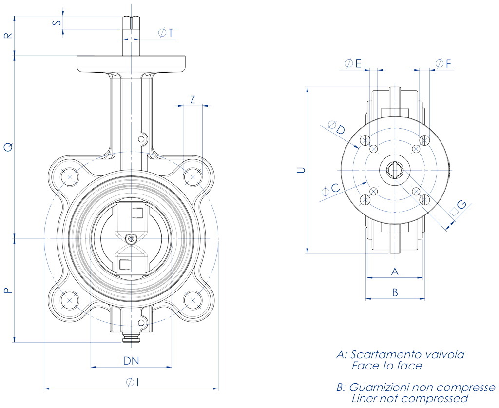วาล์วผีเสื้อ OMAL ถูกประกอบเข้ากับท่อระหว่างหน้าแปลนโดยไม่ต้องใช้แหวนอื่น ๆ และถูกจัดศูนย์ด้วยแท่งเกลียวและสกรูยึด ขนาดเส้นผ่านศูนย์กลางของหน้าแปลนต้องเป็นไปตามค่าดังต่อไปนี้