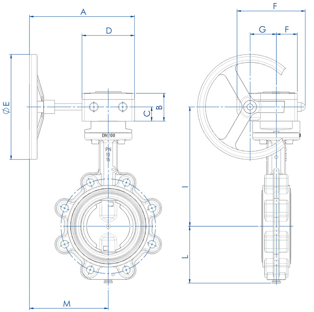 • หน้าแปลนมาตรฐาน: PN 10 = PN 16 ตั้งแต่ DN 40 ถึง DN 150; PN 10 หรือ PN 16 ตั้งแต่ DN 200 ถึง DN 300