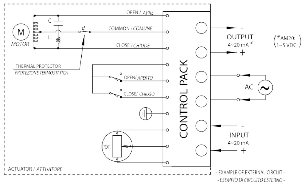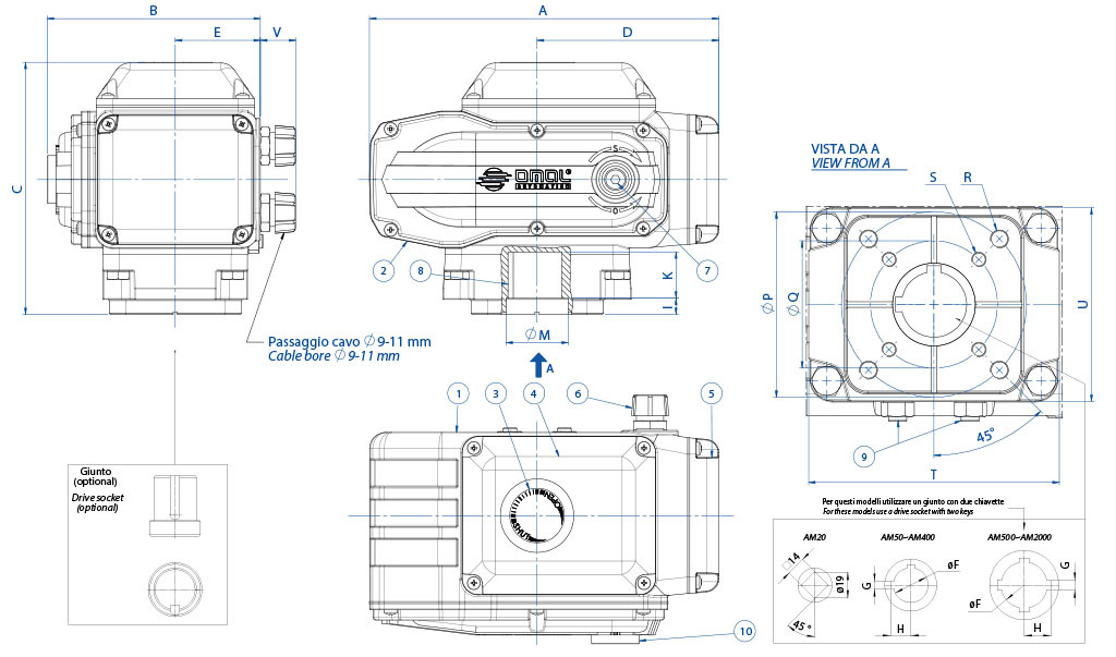 Download General catalogue ดาวน์โหลด Actuator Accessories Catalogue การถอดรหัส MAGNUM & THOR กำหนดค่าผลิตภัณฑ์ของคุณ ดาวน์โหลดไฟล์ 2D และ 3D ในหลายรูปแบบ ดาวน์โหลด Sales conditions มาโคร แอคชูเอเตอร์ไฟฟ้า การเลือกขนาด ขอข้อมูล พิมพ์หน้าเว็บ ดาวน์โหลดแค็ตตาล็อก แอคชูเอเตอร์ไฟฟ้า คุณลักษณะ ขนาด วัสดุ ข้อมูลจำเพาะ อุปกรณ์เสริม ข้อมูลทางเทคนิคตัวกระตุ้นไฟฟ้าแบบควบคุมอิเล็กทรอนิกส์ชนิดปรับค่าการทำงานได้ (MODULATING)มุมการทำงาน 90° (สูงสุด 100°)แรงบิดสูงสุดตั้งแต่ 20 ถึง 1960 Nm (ดูตารางประกอบ)แรงดันไฟฟ้า 230 Vac 1 เฟส 50/60 Hzสัญญาณขาเข้า 4~20 mA (1~5 Vdc)สัญญาณขาออก 4~20 mA (1~5 Vdc AM 20)ความละเอียดสูง 1/250 (ปรับได้ระหว่าง 1/200 ~ 1/400)สามารถปรับค่าศูนย์/ช่วงได้ตัวเลือกฟังก์ชันทิศทางการทำงานตรง/ย้อนกลับตัวเลือกโหมดการทำงานโดยไม่ต้องใช้สัญญาณ เปิด-ปิด-หยุดค่าความต้านทานฉนวน 100 M /500 Vdcความทนต่อแรงดันไฟฟ้าฉนวน 1500 Vac/1 นาทีมอเตอร์มีฉนวนคลาส Eอุณหภูมิการทำงานตั้งแต่ –25°C ถึง +55°C (หากใช้งานในอุณหภูมิต่ำกว่า 0°Cแนะนำให้ติดตั้งฮีตเตอร์ภายในตัวเครื่อง)ระดับการป้องกันตามมาตรฐาน NEMA-4X (IP66)หน้าแปลนเชื่อมต่อกับวาล์ว ตั้งแต่ F03 ถึง F14: ISO 5211ระบบป้องกันความร้อนเกินของมอเตอร์แบบเทอร์โมสตัทรีเซ็ตอัตโนมัติสวิตช์จำกัดตำแหน่ง เปิด/ปิด พร้อมแคมที่ปรับได้ตลอดช่วงการเคลื่อนที่สวิตช์จำกัดตำแหน่งพร้อมแคมที่ปรับตั้งได้สวิตช์จำกัดตำแหน่งเชิงกลที่สามารถปรับตั้งได้เพื่อความปลอดภัยตัวบ่งชี้ตำแหน่งแบบมีมาตรวัดที่มองเห็นได้ชัดเจนคันโยกถอดออกได้สำหรับการใช้งานแบบมือหมุนขั้วต่อสายไฟแบบขันสกรูการยึดสายไฟโดยใช้ตัวหนีบสายเคเบิลระดับเสียงขณะทำงานสูงสุด <70 dB (A)อุปกรณ์เสริม (ต้องระบุเมื่อทำการสั่งซื้อ)สำหรับความพร้อมใช้งานของอุปกรณ์เสริมในแต่ละรุ่น โปรดดูตารางอุปกรณ์เสริม:แรงดันไฟฟ้าป้อนเข้า 115 Vac - 24 Vacสัญญาณขาเข้า 4~12 mA (1~3 Vdc) - 12~20 mA (3~5 Vdc)สวิตช์จำกัดตำแหน่งเสริมตัวจำกัดแรงบิดฮีตเตอร์ภายในช่องต่อขับเคลื่อนกระปุกเกียร์ฉุกเฉิน แผ่นข้อมูลทางเทคนิครุ่นAM 20AM 50AM 100AM 200AM 400AM 500AM 1000AM 1500AM 2000แรงบิด (Nm)20499819639049098014701960เวลาการหมุนรอบ (50 Hz) วินาที151530153015304560เวลาการหมุนรอบ (60 Hz) วินาที12.512.52512.525252537.550การใช้พลังงาน 230Vac 50/60Hz (A)0.140.30.30.70.71.11.31.61.6การใช้พลังงาน 115Vac 50/60Hz (A)0.290.60.61.61.62.22.63.23.2การใช้พลังงาน 24Vac 50/60Hz (A)----1.81.8------------------------ ขนาดรุ่นAM 20AM 50AM 100AM 200AM 400AM 500AM 1000AM 1500AM 2000A mm.165,8207,5207,5256,5256,5381381381381B mm.114,5122,5122,5156,5156,5242242253,5253,5C mm.119,5163,5163,5185185234234234234D mm.83,3110110133,5133,5199,5199,5199,5199,5E mm.5154,554,562,562,5105105105105ØF mm.----2828363656565656G mm.----668810101010H mm.----16,516,521,321,331,331,331,331,3I mm.111,511,512128888K mm.162929343454544949ØM mm.263535404065656565ØP mm.50-F0570-F0770-F07102-F10102-F10125-F12*125-F12*140-F14140-F14ØQ mm.36-F0350-F0550-F0570-F0770-F07102-F10*102-F10*--------R x ความลึกของร่อง mm.M6x12M8x12M8x12M10x16M10x16M12x20*M12x20*M16x25M16x25S x ความลึกของร่อง mm.M5x10M6x10M6x10M8x13M8x13M10x20*M10x20*--------T mm.809898135135160160160160U mm.728686106106140140140140V mm.4044444444----------------น้ำหนัก Kg.3,14,54,58,78,722,822,822,822,8*