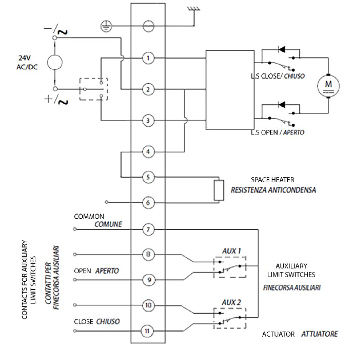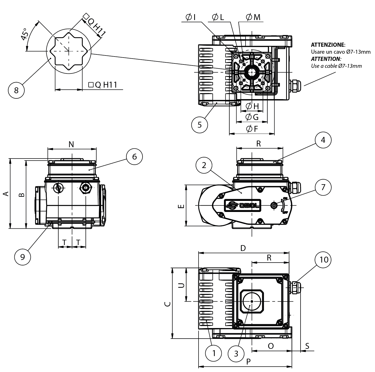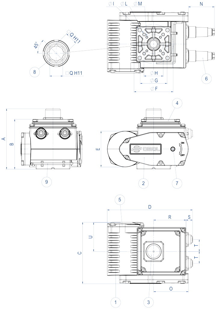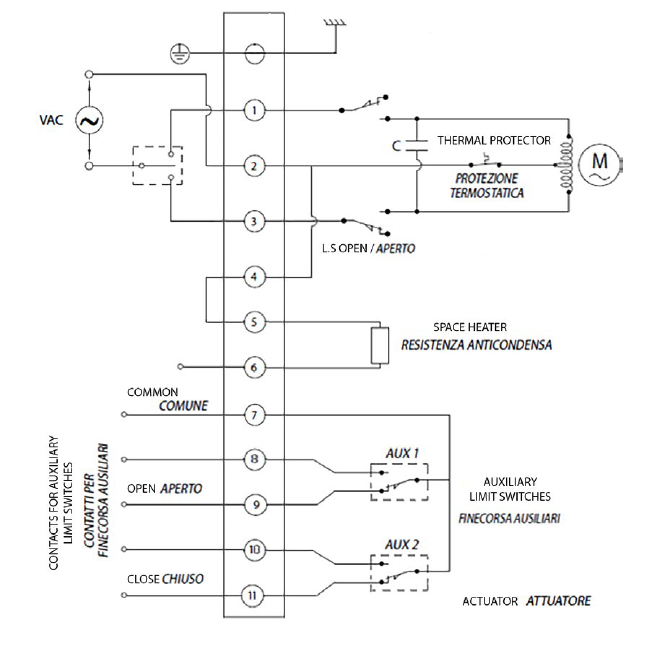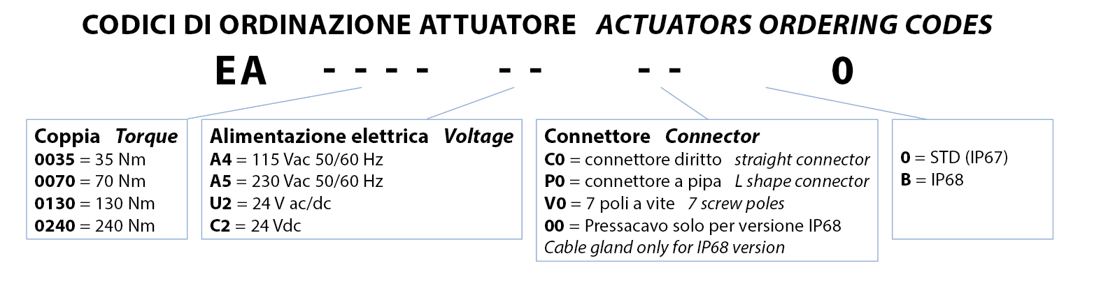 Download General catalogue ดาวน์โหลด Actuator Accessories Catalogue การถอดรหัส MAGNUM & THOR กำหนดค่าผลิตภัณฑ์ของคุณ ดาวน์โหลดไฟล์ 2D และ 3D ในหลายรูปแบบ ดาวน์โหลด Sales conditions มาโคร แอคชูเอเตอร์ไฟฟ้า การเลือกขนาด ขอข้อมูล พิมพ์หน้าเว็บ ดาวน์โหลดแค็ตตาล็อก แอคชูเอเตอร์ไฟฟ้า คุณลักษณะ ขนาด วัสดุ แผนภาพและแรงบิดเริ่มต้น ข้อมูลจำเพาะ ข้อมูลทางเทคนิคมุมการทำงานที่กำหนด: 90° ปรับได้ระหว่าง 20° ถึง 95°รูปแบบการปรับตั้ง: ปรับต่อเนื่องโดยใช้แคมล็อกตัวเองและสวิตช์จำกัดตำแหน่งแบบอิเล็กโตรเมคานิกแรงบิดที่กำหนด: ตั้งแต่ 35 ถึง 240 Nmเวลาการทำงาน (0° - 90°): ดูแผนภาพประกอบลักษณะการทำงาน: S3 ED 50% ตามมาตรฐาน CEI 60043ข้อกำหนดที่ใช้บังคับ: ข้อกำหนดความปลอดภัยแรงดันต่ำ 2014/35/UE; ข้อกำหนดความเข้ากันได้ทางแม่เหล็กไฟฟ้า 2014/30/CEระดับการป้องกัน: IP67 ตามมาตรฐาน EN60529อุณหภูมิการทำงาน: -25° ถึง +60°Cอุณหภูมิการจัดเก็บ: -40° ถึง +90°Cมอเตอร์มีระบบป้องกันความร้อนเกินแบบเทอร์โมสตัทรีเซ็ตอัตโนมัติในตัวมอเตอร์มีฉนวนคลาส F (155°C)โรเตอร์รองรับด้วยตลับลูกปืนมีช่องต่อสำหรับคันโยกมือหมุนฉุกเฉิน (ประแจหกเหลี่ยมรวมอยู่ในชุดอุปกรณ์)ตัวบ่งชี้ตำแหน่งภายนอกพร้อมฝาครอบที่มีมาตรวัดฮีตเตอร์ภายใน (มาตรฐาน)ขั้วต่อแบบ IP67 มีให้เลือกเพิ่มเติม พร้อมสายไฟต่อสำเร็จตามคำขอมีสวิตช์จำกัดตำแหน่งเสริมแบบอิเล็กโตรเมคานิก 2 ตัวชนิด SPDT พร้อมแคมปรับได้ตลอดช่วงการเคลื่อนที่ระดับเสียงขณะทำงานสูงสุด: <70 dB (A)แรงดันไฟฟ้าจ่าย: 230 Vac ±10%, 50/60 Hz เฟสเดียว; 115 Vac ±10%, 50/60 Hz เฟสเดียว; 24 V ac/dc ±10%; 24 V dc ±5% แรงบิดรุ่นEA0035EA0070EA0130EA0240แรงบิดขณะทำงานที่กำหนดNm3570130240แรงบิดสูงสุดขณะพีคNm4585160280 รหัสการสั่งซื้อตัวกระตุ้น รุ่น IP67 ขนาด ABCDEøFøGøHøIøLøMNOP☐QRSTUKgEA003513710913219084705036M8x14M6x11M5x97074591469182667,53,6EA0070137109136190847050- -M8x14M6x11- -7074591469182667,53,8EA0130157,5129,5160221,5931027050M10x17M8x15M6x1167,590,55717841731767,2EA0240157,5129,5163,5221,59310270- -M10x17M8x15- -67,590,55722841731767,5 รุ่น IP68 ขนาดABCDEøFøGøHøIøLøMNOP☐QRSTUKgEA0035142,1137,513217284705036M8x14M6x11M5x9109,874177,11469142667,53,8EA0070142,1137,5136172847050- -M8x14M6x11- -109,874177,11469142667,54EA0130162,8158,2160204,6931027050M10x17M8x15M6x11109,890,5211,117841231767,4EA0240162,8158,2163,5204,69310270- -M10x17M8x15- -109,890,5211,122841231767,7 รุ่น IP67 วัสดุ1ตัวเรือนอะลูมิเนียม2ฝาครอบกระปุกเกียร์อะลูมิเนียม3ตัวบ่งชี้ตำแหน่งPMMA4ฝาครอบชุดไฟฟ้าอะลูมิเนียม5ฝาครอบกล่องขั้วต่อสายไฟอะลูมิเนียม6ขั้วต่อPA6 / PBT7ข้อต่อคันโยกเหล็ก8เพลาขับตัวเมียสแตนเลส9คันโยกสแตนเลส รุ่น IP68 วัสดุ1ตัวเรือนอะลูมิเนียม2ฝาครอบกระปุกเกียร์อะลูมิเนียม3ตัวบ่งชี้ตำแหน่งPMMA4ฝาครอบชุดไฟฟ้าอะลูมิเนียม5ฝาครอบกล่องขั้วต่อสายไฟอะลูมิเนียม6กล่อง H27อะลูมิเนียม7ข้อต่อคันโยกเหล็ก8เพลาขับตัวเมียสแตนเลส9คันโยกสแตนเลส10ข้อต่อสายไฟทองเหลือง แผนภาพการทำงาน EA0035 แผนภาพการทำงาน EA0070 แผนภาพการทำงาน EA0130 แผนภาพการทำงาน EA0240 การเดินสายไฟฟ้าแบบ IP67 สำหรับ