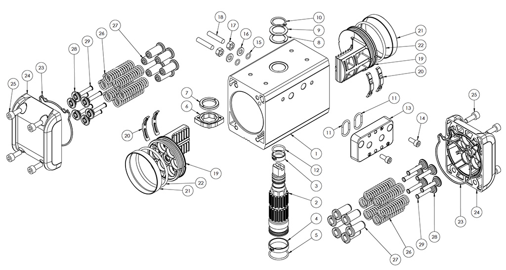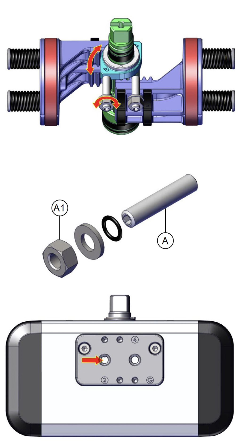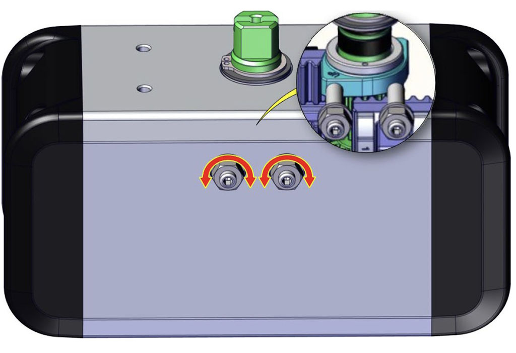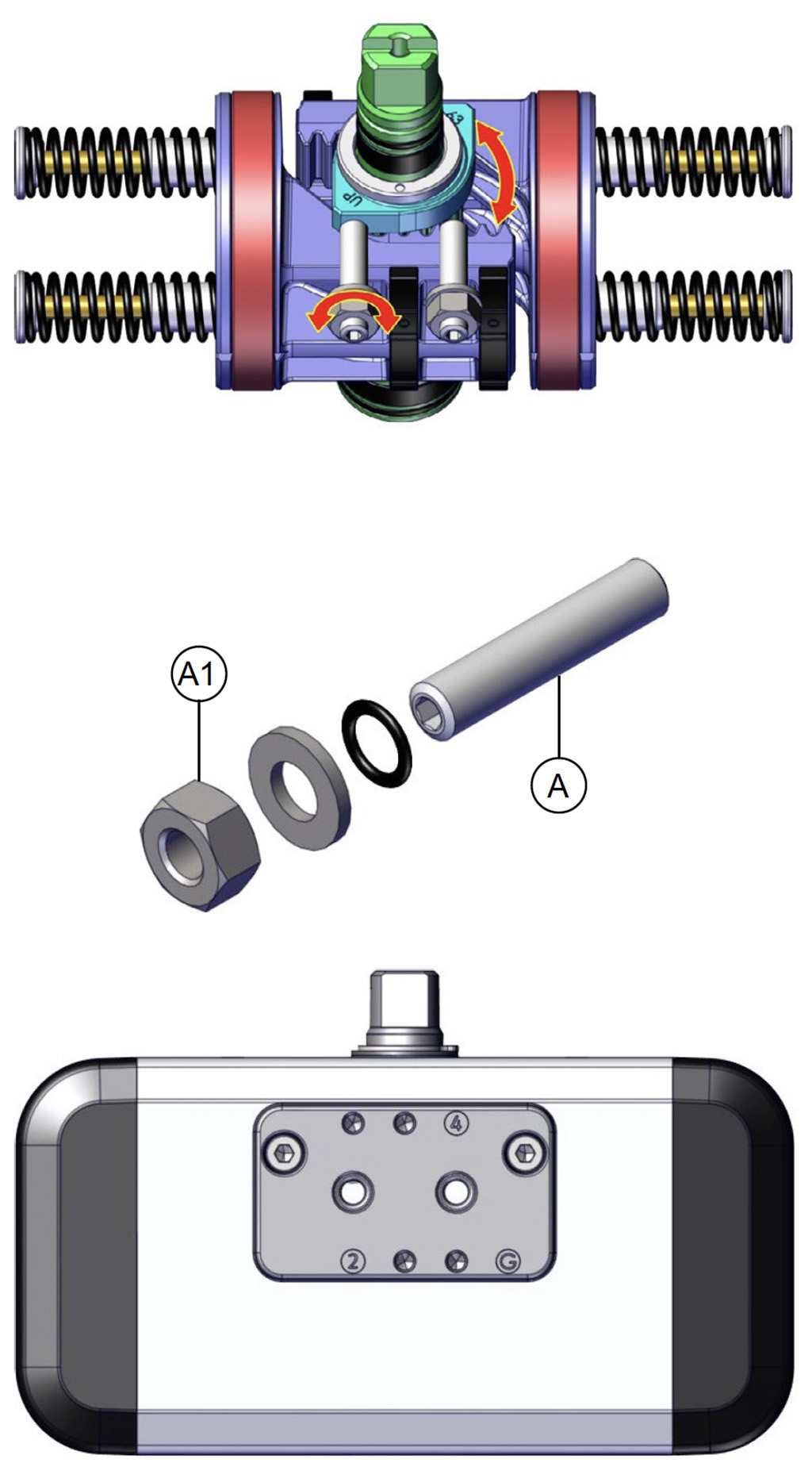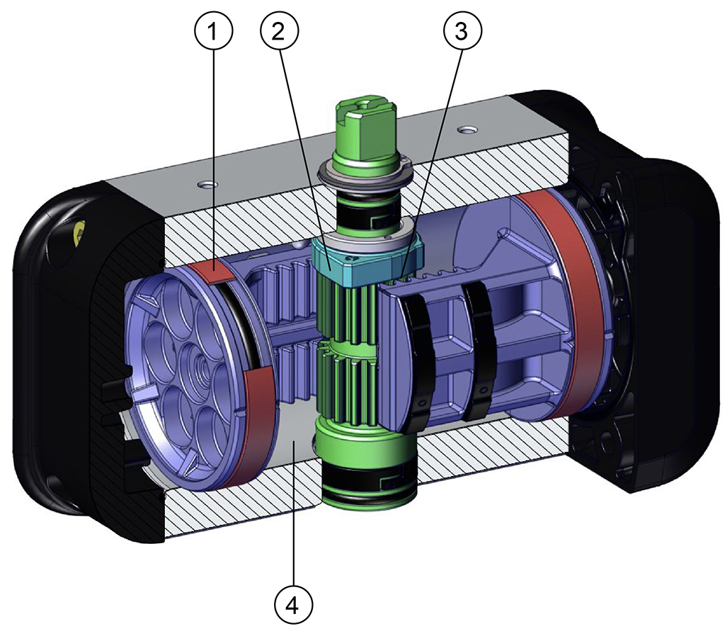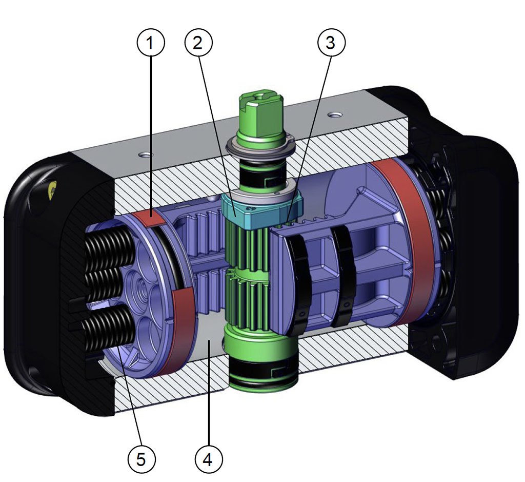 เมื่อไม่มีการจ่ายลม แอคชูเอเตอร์แบบสปริงรีเทิร์นจะกลับสู่ตำแหน่งพัก โดยเพลาจะหมุนตามเข็มนาฬิกา ภาพแสดงตำแหน่งสุดท้ายของเพลา แนะนำให้ติดตั้งตัวกรองขนาดเล็กที่ข้อต่ออากาศหมายเลข 4 เพื่อป้องกันฝุ่นและสิ่งแปลกปลอมเข้าสู่กระบอกสูบ โดยไม่ขัดขวางการไหลของอากาศ