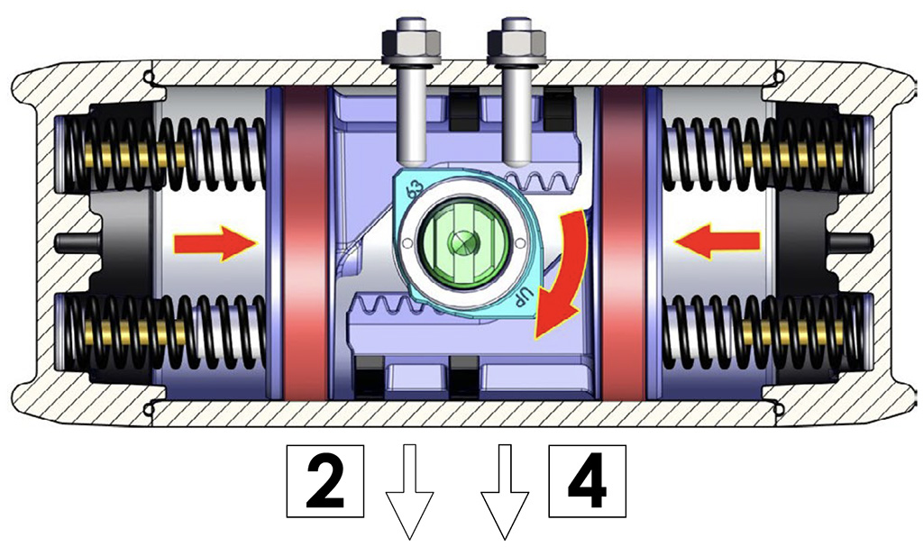 เมื่อจ่ายลมผ่านข้อต่ออากาศหมายเลข 2 ลูกสูบจะเคลื่อนที่ออกด้านนอกและกดสปริง เพลาจะหมุนตามเข็มนาฬิกา และตำแหน่งสุดท้ายจะแสดงอยู่ด้านบน