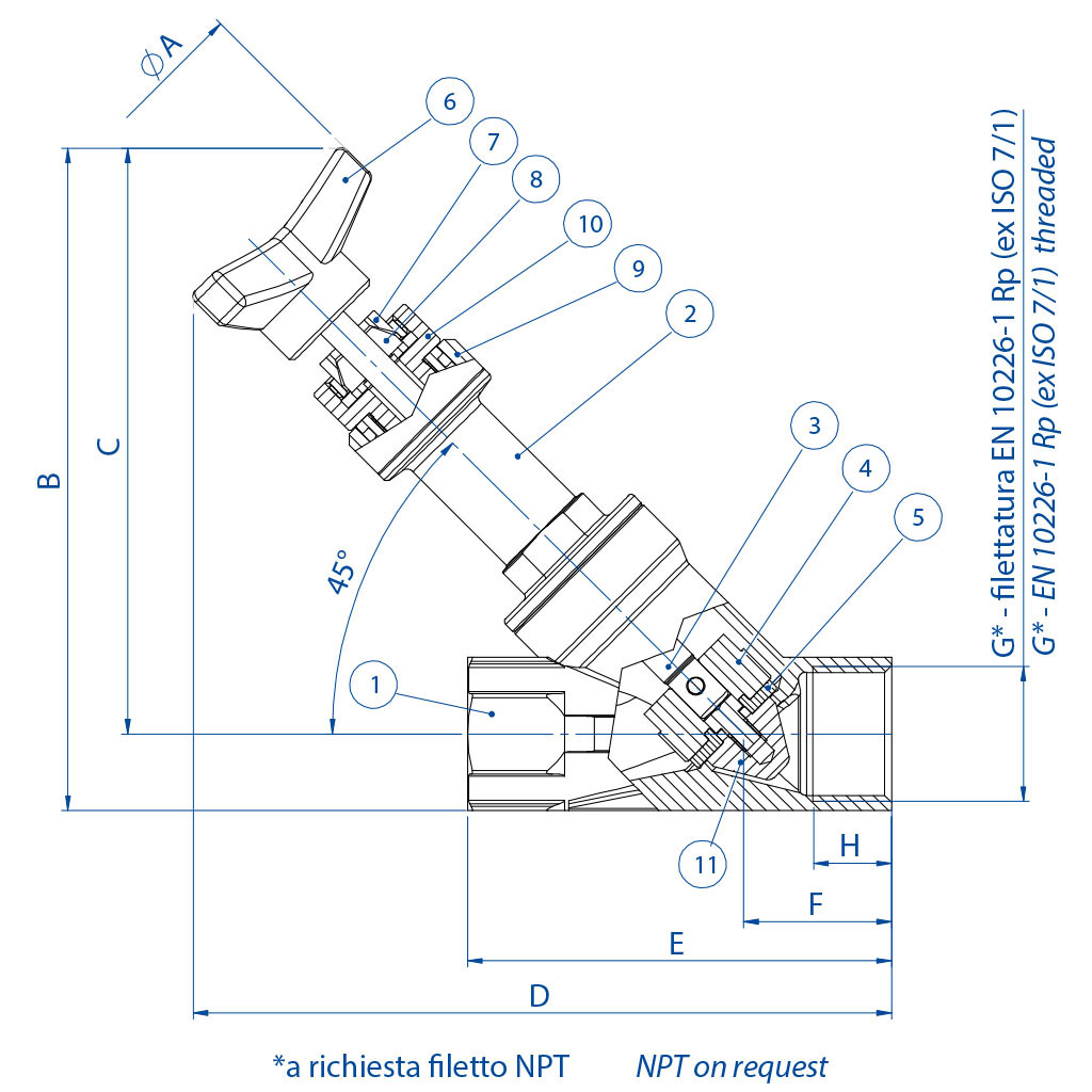 VIP - วาล์วนิวเมติกแบบแกนร่วม VIP (NEW MODEL) - วาล์วโคแอกเซียลนิวเมติก VIP EVO วาล์วแองเกิลซีท ZEUS ARES-ATENA (อาเรส‑อาเตนา) ARES พร้อมปลายพิเศษ ARES แบบขับเคลื่อนด้วยมือ Download General catalogue ดาวน์โหลด Actuator Accessories Catalogue การถอดรหัส MAGNUM & THOR กำหนดค่าผลิตภัณฑ์ของคุณ ดาวน์โหลดไฟล์ 2D และ 3D ในหลายรูปแบบ ดาวน์โหลด Sales conditions มาโคร วาล์วนิวเมติก หมวดหมู่ วาล์วแองเกิลซีท หมวดย่อย ARES แบบขับเคลื่อนด้วยมือ กำหนดค่า END CONNECTION ขอข้อมูล พิมพ์หน้าเว็บ ดาวน์โหลดแค็ตตาล็อก วาล์วแองเกิลซีท คุณลักษณะ ขนาด วัสดุ เอกสาร คุณลักษณะทั่วไป (GENERAL FEATURES):วัสดุตัวเรือนวาล์ว: A351-CF8M (สแตนเลส 316)ปลายวาล์ว: ดูตามแผนผังรหัส (code plan)สามารถติดตั้งได้ทุกตำแหน่ง: ตั้งตรง, นอนราบ หรือเอียงมีช่วงขนาดตั้งแต่ DN10 ถึง DN50มีรุ่นพร้อมอุปกรณ์ล็อก (Locking device)การกำหนดค่าตามข้อกำหนด 2014/34/EU ATEX ต้องระบุเมื่อสั่งซื้อตามคำขอ: มีรุ่นสำหรับงานสูญญากาศและงานออกซิเจนสื่อการทำงาน (OPERATING MEDIA):อากาศ, น้ำ, แอลกอฮอล์, น้ำมัน, ผลิตภัณฑ์ปิโตรเลียม, น้ำเกลือ, ไอน้ำ ฯลฯ (ตราบเท่าที่เข้ากันได้กับ A351-CF8M (316) หรือ PTFE)ความดัน: 0 ถึง 25 บาร์ (สำหรับไอน้ำที่ 180°C อยู่ในช่วง 0 ถึง 10 บาร์ ขึ้นอยู่กับรุ่นที่เลือก)อุณหภูมิ: –10°C ถึง 180°Cความหนืดสูงสุด: 600 cst (mm²/s) ขนาดDN [mm]G * [inch]øABCDEFH153/8”63138,51261698534,512151/2”63138,51261698534,515203/4”63148,5133176,29534,716,3251”63152133178,110536,619,5321”1/4100191,5168222,512040,519401”1/21001971702251304118502”100213180239,515045,520*เกลียว NPT สามารถสั่งได้ตามคำขอ วัสดุลำดับคำอธิบายวัสดุ1ตัววาล์วCF8M2ปลอกCF8M3ก้านวาล์วสแตนเลส 316L4ปลั๊กสแตนเลส 316L5ซีลของปลั๊กPTFE6ด้ามจับเทคโนพอลิเมอร์7น็อตล็อกสแตนเลส 3048คีมล็อกทองเหลือง9บูชอลูมิเนียมอัลลอย10น็อตยึดแพ็คกิ้งสแตนเลส 30411โอโกฟ์ (Ogive)สแตนเลส 304 ใบรับรอง ATEX - Pneumatic Valves PED UKCA กำหนดค่า END CONNECTION เลือกมาตรฐานการค้นหา -- END CONNECTION -- ปลายเกลียวตามมาตรฐาน ISO 228/1 ปลายเชื่อมตามมาตรฐาน ISO 4200 ไตรแคลมป์มาตรฐานสหรัฐอเมริกา 3A ปลายเกลียวแบบ NPT หน้าแปลนตามมาตรฐาน UNI 6093 และ 2229 ค้นหารายการ