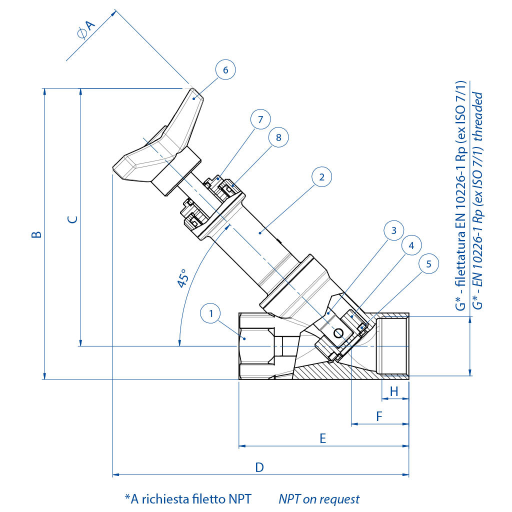 VIP - วาล์วนิวเมติกแบบแกนร่วม VIP (NEW MODEL) - วาล์วโคแอกเซียลนิวเมติก VIP EVO วาล์วแองเกิลซีท ZEUS ARES-ATENA (อาเรส‑อาเตนา) ARES พร้อมปลายพิเศษ ARES แบบขับเคลื่อนด้วยมือ Download General catalogue ดาวน์โหลด Actuator Accessories Catalogue การถอดรหัส MAGNUM & THOR กำหนดค่าผลิตภัณฑ์ของคุณ ดาวน์โหลดไฟล์ 2D และ 3D ในหลายรูปแบบ ดาวน์โหลด Sales conditions มาโคร วาล์วนิวเมติก หมวดหมู่ วาล์วแองเกิลซีท หมวดย่อย ARES แบบขับเคลื่อนด้วยมือ กำหนดค่า END CONNECTION ขอข้อมูล พิมพ์หน้าเว็บ ดาวน์โหลดแค็ตตาล็อก วาล์วแองเกิลซีท คุณลักษณะ ขนาด วัสดุ เอกสาร คุณลักษณะทั่วไป (GENERAL FEATURES):วัสดุตัวเรือนวาล์ว: A351-CF8M (สแตนเลส 316)ปลายวาล์ว: ดูตามแผนผังรหัส (code plan)สามารถติดตั้งได้ทุกตำแหน่ง: ตั้งตรง, นอนราบ หรือเอียงมีช่วงขนาดตั้งแต่ DN10 ถึง DN50มีรุ่นพร้อมอุปกรณ์ล็อก (Locking device)การกำหนดค่าตามข้อกำหนด 2014/34/EU ATEX ต้องระบุเมื่อสั่งซื้อตามคำขอ: มีรุ่นสำหรับงานสูญญากาศและงานออกซิเจนสื่อการทำงาน (OPERATING MEDIA):อากาศ, น้ำ, แอลกอฮอล์, น้ำมัน, ผลิตภัณฑ์ปิโตรเลียม, น้ำเกลือ, ไอน้ำ ฯลฯ (ตราบเท่าที่เข้ากันได้กับ A351-CF8M (316) หรือ PTFE)ความดัน: 0 ถึง 25 บาร์ (สำหรับไอน้ำที่ 180°C อยู่ในช่วง 0 ถึง 10 บาร์ ขึ้นอยู่กับรุ่นที่เลือก)อุณหภูมิ: –10°C ถึง 180°Cความหนืดสูงสุด: 600 cst (mm²/s) ขนาดDN [mm]G * [inch]øABCDEFH153/8”63138,51261698534,512151/2”63138,51261698534,515203/4”63148,5133176,29534,716,3251”63152133178,110536,619,5321”1/4100191,5168222,512040,519401”1/21001971702251304118502”100213180239,515045,520เกลียว NPT สามารถสั่งได้ตามคำขอ วัสดุลำดับคำอธิบาย วัสดุ1ตัววาล์วCF8M (สแตนเลส 316)2ปลอกCF8M (สแตนเลส 316)3ก้านวาล์วสแตนเลส 316L4ปลั๊กสแตนเลส 316L5ซีลของปลั๊กPTFE6ด้ามจับเทคโนพอลิเมอร์7น็อตยึดแพ็คกิ้งสแตนเลส 3048บูชอลูมิเนียมอัลลอย ใบรับรอง ATEX - Pneumatic Valves PED UKCA กำหนดค่า END CONNECTION เลือกมาตรฐานการค้นหา -- END CONNECTION -- ปลายเกลียวตามมาตรฐาน ISO 288/1 ปลายเกลียวแบบ NPT ปลายเชื่อมตามมาตรฐาน ISO 4200 ไตรแคลมป์ตามมาตรฐาน ISO 2852 หน้าแปลนตามมาตรฐาน UNI 6093 และ 2229 หน้าแปลนตามมาตรฐาน ANSI 150 RF ไตรแคลมป์มาตรฐานสหรัฐอเมริกา 3A ค้นหารายการ